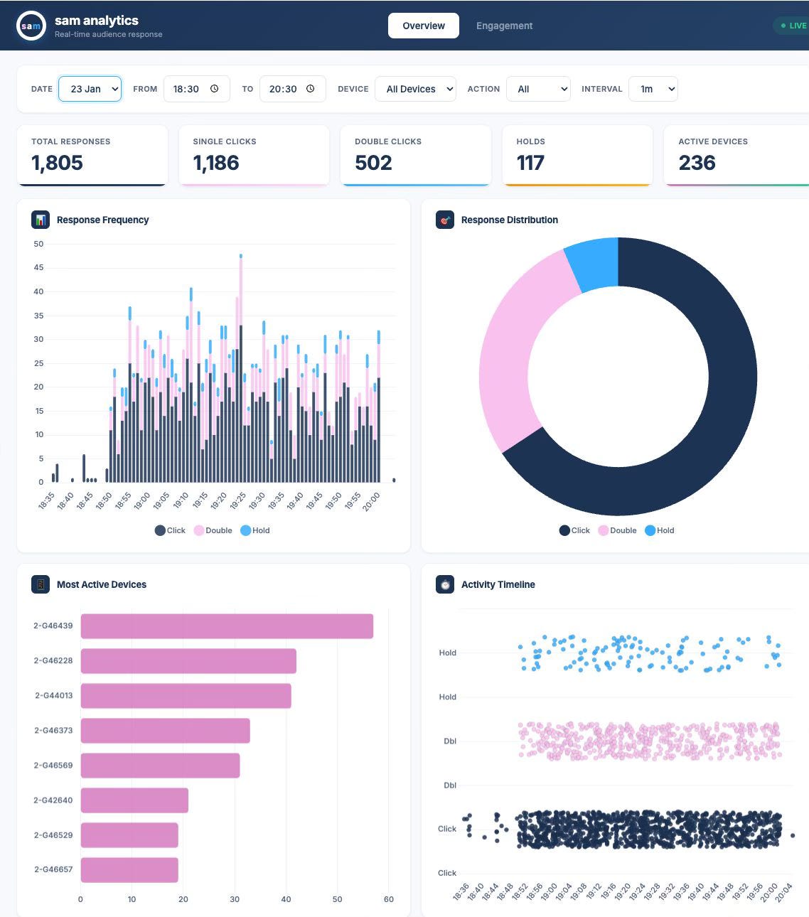 You’ll see from the last post that I have just revealed my new ’sam’ buttons - ’social affect measure’ - which we have been developing since the Happiness Experiment with Fatboy Slim. The buttons can measure any three feelings or reactions, depending on the presses. Biometric data can enhance our understanding of emotion but asking people still remains best way to find out how they’re feeling. The buttons allow us to do this in the least invasive way possible. And to be able to produce some cool dashboards as shown here. Message me if you want to find out more about using sam.